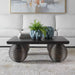 This coffee table is sure to be the focal point of any room, featuring oversized rattan-covered spheres as legs. The table is crafted from mango-wood veneer and finished in a distressed black.