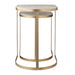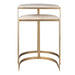 A sophisticated pair of nesting tables featuring a curved metal strap frame in a refined gold finish and two elegant travertine tabletops.