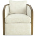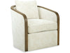 A modern swivel chair is a versatile, functional piece in any space, but this one with stunning wood trim detailing is on a whole other level. The flat wood banding wraps the front and then curves around the back, making this piece a show-stopper from any angle. It features Paula's exclusive Blend-Down seat cushion and loose bed-pillow back for a plush, comfortable seat.