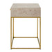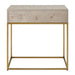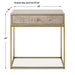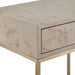 The Pembrook side table embodies modern sophistication with its light washed maple burl veneer, perched atop a sleek steel base finished in plated brushed brass with a coordinating drawer pull.