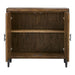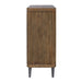 This mango wood cabinet boasts a warm, light walnut finish, highlighted by a subtle tambour design around the piece, adding visual interest and texture. Sleek matte black door pulls and legs offer a sophisticated, cohesive finish.