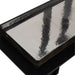 Designed for both style and functionality, this pull-up style table features a sleek black iron frame and a thick, cast glass top.