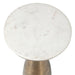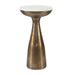 Elevate your living space with the Torin drink table, a study in sophisticated simplicity. Its sleek silhouette begins with a gracefully tapered base, expertly cast from aluminum and finished in antique brass, topped with a white marble slab with natural toned veining. True to the nature of natural materials, each piece will have unique marbling and veining throughout.