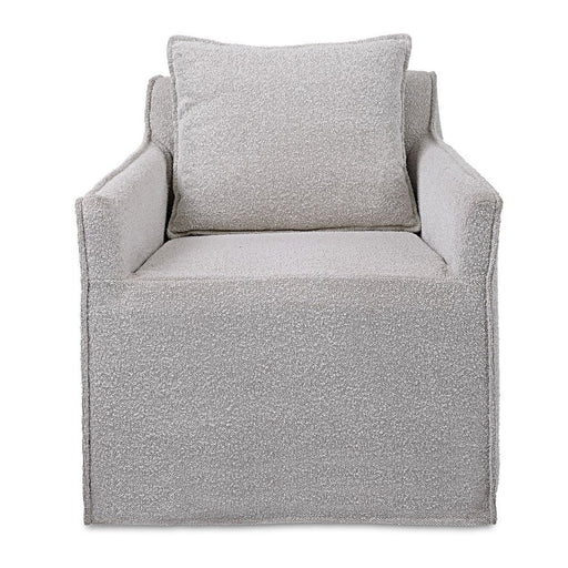 UttermostCasual swivel accent chair features a tailored slipcover made from ivory andlight gray boucle fabric with flanged edges and a matching square pillo...