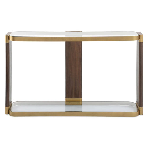 UttermostThe Ryles console table features elegant walnut veneer legs with gold finished iron detailing around the edges. The table is complemented by both a...