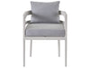The South Beach Dining Chair introduces a casual elegance to outdoor dining spaces with light gray seat cushions perfectly complemented by a fresh white-hued aluminum body with subtle curvature.