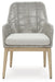 This dining arm chair invites your casual contemporary style outdoors. With its resin wicker in a chic neutral hue, it expertly marries refined design with durability. Breezy summer mornings and cold winter nights are made all the more comfortable with high-performance Nuvella+ fabric covering the seat cushion.