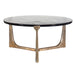 Crafted from a combination of antique brass finished cast aluminum and rich cast glass, this coffee table showcases exquisite craftsmanship. The warm tones of the brass frame complement the unique texture of the glass top, creating a truly captivating piece. Suitable for both indoor and outdoor use.