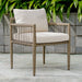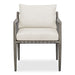 Crafted from rich, weathered dark gray mahogany and adorned with hand wrapped rope along the sides, the Borneo dining chair offers a touch of rustic elegance. Oyster white cushions in solution dyed acrylic fabric provide a comfortable contrast to the natural wood and woven accents.