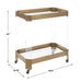 The Giselle bar cart features large metal strap sides finished in bronze that surround glass shelves to eliminate spills that will crash your party. The acrylic legs seamlessly connect the top and bottom shelves creating a floating illusion from afar.