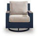 Easy-breezy beauty, made to withstand the elements. This outdoor swivel glider lounge chair makes a serene statement with its soothing shade of blue and contrasting wood-look arms. A cushioned seat and back keep you comfy as you lounge. Crafted with durable materials for added longevity, it's a smartly stylish addition to your outdoor oasis.