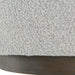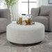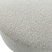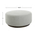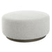 This plush ottoman is covered in a casual ivory and warm gray boucle fabric with a natural walnut stained wood base. Perfect as a coffee table topped with an oversized tray.