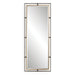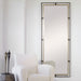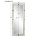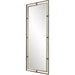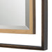 This iron frame features a 3-dimensional design with an outer frame finished in distressed rustic bronze, accented by a lightly antiqued gold leaf inner frame. This mirror is complemented by a 1 1/4" bevel and may be hung horizontal or vertical.