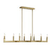 Clean, hefty lines make up this 8 Lt. linear chandelier. The robust framework body is suspended by two adjustable-length stems all in a strong natural brass finish. 8-60 watt max candelabra sockets. Bulbs not included. Supplied with 20' wire, 6-12" stems and 2-6" stem for adjustable installation.