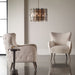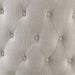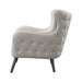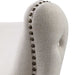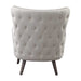 Add classic elegance to a space with this wing back lounge chair. Covered in a cream linen blend fabric, complete with a button tufted surround and trimmed with antique bronze finished nail heads. The accent chair is set on oak finished dowel legs with a lightly applied gray wash, showcasing the natural wood grain.