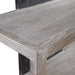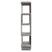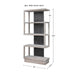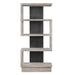 The dramatic contrast of this asymmetrical etagere gives an updated contemporary feel, featuring elm veneer shelving finished in light gray, accented with a deep black recessed panel with a light gray glazing.