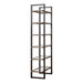 This forged iron framed etagere, finished in aged steel with light distressing features six display shelves with driftwood finished surrounds, inset with clear glass.