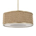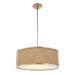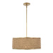 Natural woven X pattern rattan with a white fabric liner make up the unique hanging shade for this 4 Lt pendant, all with a Brushed Matte Gold finish. 4-60 watt max, Edison sockets. Bulbs not included. Supplied with 15' wire, 3-12" stems,and 1-6" stem for adjustable installation also includes 1-3" rod for semi-flush mounting option.