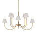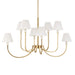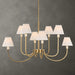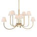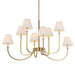 Charming 8 Lt oval chandelier featuring a warm brass finish with white alabaster accents topped with pleated white fabric shades. 8-60 watt max candelabra sockets. Bulbs not included. Supplied with 20' wire, 3-12" stems and 1-6" stem for adjustable installation.