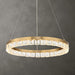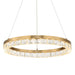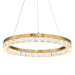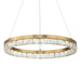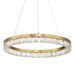 Gems of crystal in a sparkling ring are illuminated from an LED light source finished in warm brass. Supplied with 15' airplane wire for adjustable suspension installation. No bulb required with the built-in LED light strip; 40 watt, 3000K, CRI of 95, 1814 Lumens, 50,000 estimated hours of illumination, compatible with Lutron DVCL-153P dimmer.