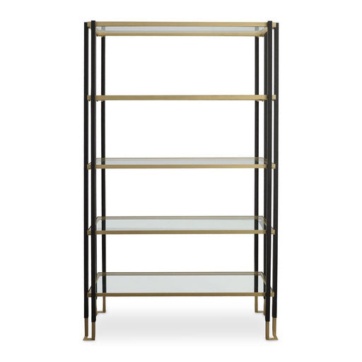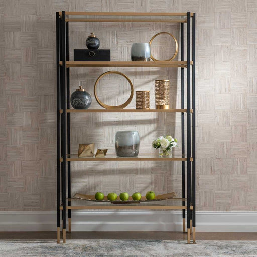 UttermostFeaturing a clean lined solid iron frame, this contemporary etagere is finished in a two-toned matte black and gold leaf. Has five tempered glass s...