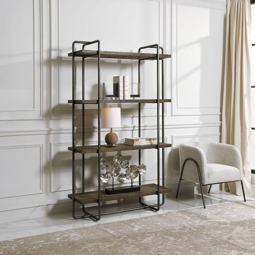 UttermostThis six-shelf design offers fun display options with staggered multi-level shelving using reclaimed pine framed in iron with an aged black finish....