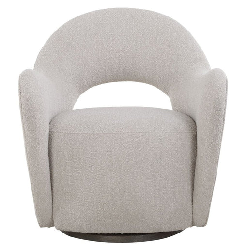 UttermostGentle curves and fun cutouts give a unexpected twist in the Wander swivel chair. Upholstered in an oat toned polyester blend with wool-like textur...