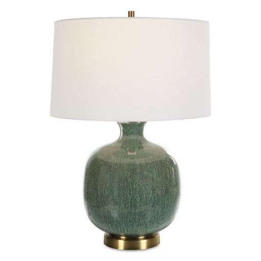 UttermostThis unique ceramic lamp showcases a gracefully curved base finished in a crackled aged green glaze with dark bronze undertones, accented with anti...