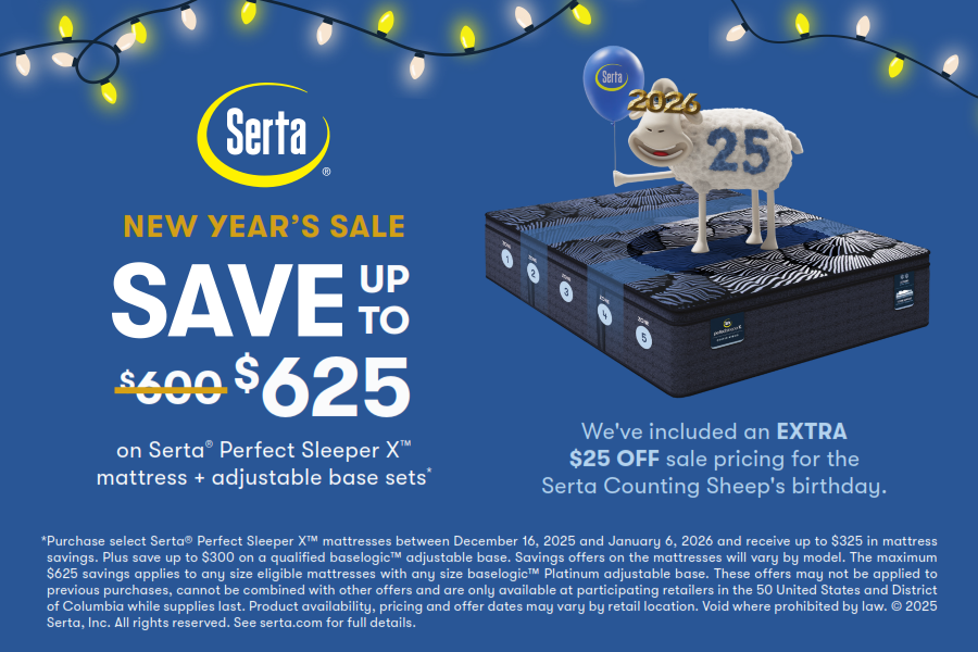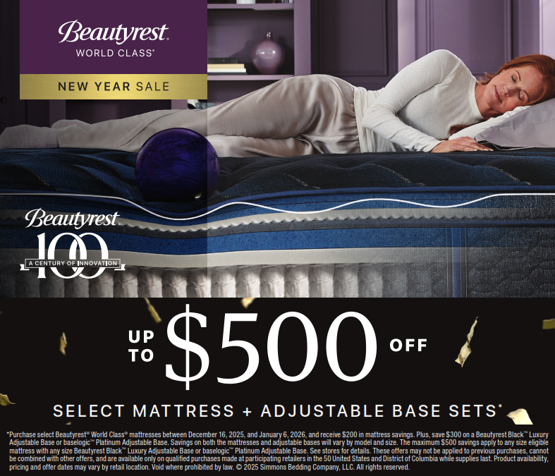 *COUPON OFFERS: Expire 1/4/2026. $100, $200, $300, & $500 coupons are limited to one coupon per household. $100, $200, $300, & $500 coupon offers may not be combined with one another. Prior purchases are excluded. Excludes closeouts and appliances. Not valid on advertised items. Builder and contract sales are excluded. Labor, delivery and installation is excluded. See store for details. Customary deposit required on special orders and on merchandise held for later delivery.