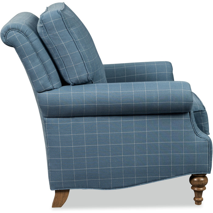 Classic traditional details are the things you'll notice first on this gracefully finessed chair. It features a rollover back, cut-back rolled arms, and beautifully turned legs that offer a familiar heirloom touch. Attached box border back pillow. Also available is the matching ottoman. Also available with nail head trim as style 028210.