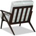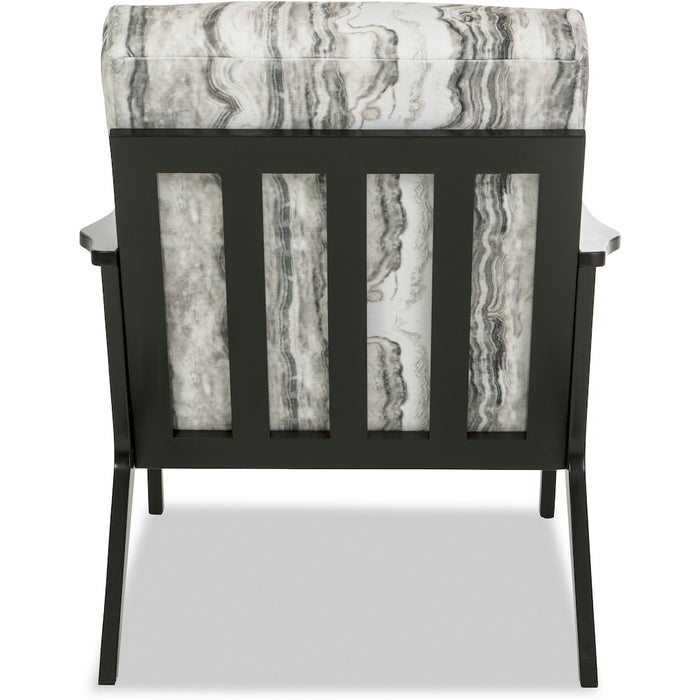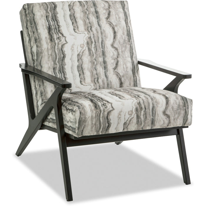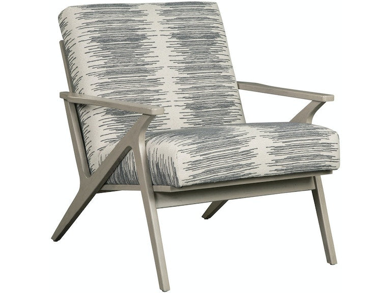 Clean lines with a nod to mid century modern styling make this chair a stand-out. It features an angular wood frame with a tight seat and back. Back of chair has vertical wood slats.