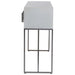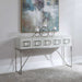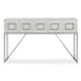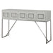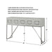Clean contemporary styling, featuring oak veneer finished in a soft white with light gray distressing. Accented with statement hardware in brushed nickel stainless steel with a coordinating base. Has two double drawers and one single drawer in the center.