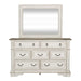 Design possibilities are endless with the Abbey Park California king sleigh bed, dresser, mirror, and chest. Crafted of poplar solids and cathedral white oak veneers, this kit features an antique white finish with heavy chipping and weathered brown whitewash tops, full extension drawers, premium felt lined top drawers and cedar lined bottom drawers, and is accented with antique pewter bail pull and drop ring hardware. This sleigh bed features a rolled headboard and a bent rolled footboard, both upholstered in a beautiful, tufted chenille. The dresser has seven drawers and can equip the mirror that features a beveled edge with the included bolt-on supports. The chest offers an additional five drawers of storage. The blending of European traditional design influences makes Abbey Park a truly unique style for any living space.