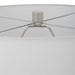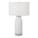 Inspired by farmhouse style pottery, this table lamp is handcrafted from ceramic finished in a textured white glaze with a natural bottom, paired with plated brushed nickel accents. A white drum shade complements this piece.