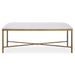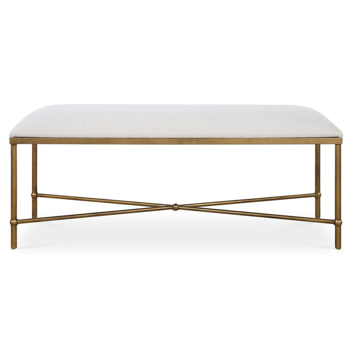Thoroughly modern yet inspired by the classics, this bench displays a stylish iron frame in a rich antique gold finish, upholstered in a crisp white textured fabric.