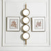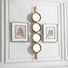 Contemporary in style, this mirror features a sleek iron base with linear metal accents. The piece is finished in gold leaf with four round beveled mirrors. Group multiple pieces together and hang horizontal or vertical to create a truly unique wall feature.