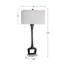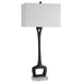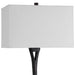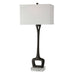 This cast iron table lamp is finished in a masculine aged black with a heavy organic texture displayed on an elegant crystal foot. The lamp is paired with a rectangular hardback shade in a white linen fabric with vertical slubbing.