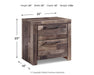 Modern yet hefty. This nightstand makes an urban eclectic statement. Seasoned raw wood look merges with the clean lined design we love today. Muted rustic finish over replicated pine grain maintains its authenticity. Roomy drawers are flanked with attractive framed front and pilasters. Handles with antiqued gunmetal finish complete this beauteous look with easy to pull function.