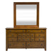 Complete your rustic American look with the Grandpa’s Cabin king sleigh bed, dresser and mirror. Crafted of rubberwood solids and oak veneers, this kit features complete case dust proofing to protect your contents, French and English dovetail drawer construction, full extension and fully stained interior drawers, bluff-cut drawer fronts, wood and peg accents that offer a craftsman feel, and is accented with antique brass knob hardware. The sleigh bed offers a planked style on the headboard and footboard, a center support slat system and bolt on rails, ensuring reliability and longevity. The dresser has seven drawers and pairs well with the large picture frame mirror with a 1” bevel and includes bolt-on supports.