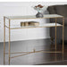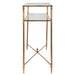 An elegant silhouette in iron with a cross stretcher accent finished in gold leaf with heavy antiquing. Top is reinforced mirror and gallery shelf is clear tempered glass.