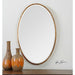 Narrow, hand forged metal frame finished in heavily antiqued, plated gold. Mirror is beveled and may be hung horizontal or vertical.