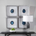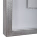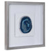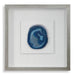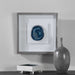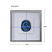 A pine wood shadow box featuring a hand applied silver leaf finish showcases a striking blue agate stone with light blue veining, accented with hand painted silver edging. Mounted on a white linen backing.