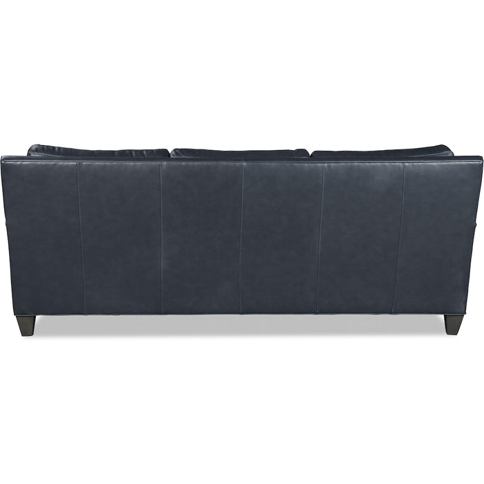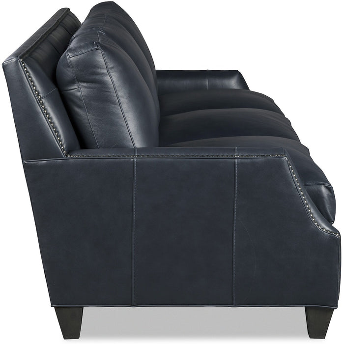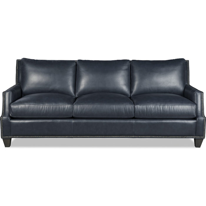 Transitional styling allows this leather sofa to feel at home in both traditional or modern settings. Nail head trim frames the top and bottom rails and accents the dramatic shape of the arms. Tapered legs further enhance the clean look. With attached back pillows and Blend-Down Coil seat cushions, you won't believe the comfort! Optional nail finishes available. Also available are the matching loveseat, chair, and ottoman. Also available without nail head trim.