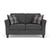 Libby is a transitional stationary style with clean lines and graceful curves. Its off-the-floor frame is complimented by square tapered legs. This loveseat features an elegant roll arm with a detailed welt trim. Two square accent throw pillows are provided. The posh and plush style of Libby fits in with many home décor spaces.