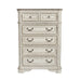 Opt for an elegant display. A refined yet relaxed feel describes the Magnolia Manor king upholstered sleigh bed, dresser, mirror, and chest. Crafted of poplar solids with white oak and birch veneers, this kit features an antique white finish with heavy artistic chipping and weathered brown with whitewash tops. The bed is upholstered in tufted chenille, laced with tone’s of white, tan and brown threading. The rolled upholstered headboard and footboard effortlessly adds both definition and character, completing your look. The dresser and mirror duo are the perfect way to accent your room. Weathered brown whitewash tops paired with the antique white finish creates a truly unique look. Softness is added to the design with canted corners and rounded pilasters, accompanied by bead molding on each drawer front. The dresser and chest feature full extension drawer glides for easy access to storage, fully stained interior drawers, felt lined top drawers, and dust proofed bottom drawers that are accented by antique pewter bail and knob hardware. Warm antique finishes and artistic distressing along with grand scale a group to be passed to generations.