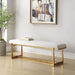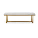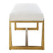 This elegant bench adds a touch of luxury to any room. The textured antique gold finish iron legs perfectly support and accentuate the upholstered top in a driftwood toned polyester blend with wool-like texture.