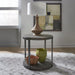 Transform your space with the simplistic Modern View round end table. Crafted of metal with split heart oak veneers, this piece features a gauntlet gray finish with wire brush distressing, one bottom shelf with a beautiful open shelf design, anchored by pewter metal legs. This unique table would make a great addition to any contemporary home.