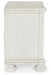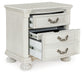 Details Made with hardwood solids, veneer and MDF substrate with cast resin components, Antiqued white finish, Metal pulls with polished pewter-tone finish, 2 smooth-gliding drawers with fully finished interiors, Drawers with French/English dovetail construction and heavy-duty ball-bearing side glides (pull-out tray and top drawer felt lined), Pull-out tray behind bottom drawer, Thick decorative moulding, Reeded bun feet