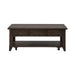 Create an unforgettable setting of casual elegance with the Paradise Valley lift-top cocktail table. Crafted with Rubberwood solids and Split Heart White Oak veneers, this piece features a Saddle Brown finish. The tabletop showcases a bread board veneer pattern and lifts to reveal hidden storage underneath. The wood framed apron and chamfered legs flow to the open bottom shelf for additional storage or display items. Casters ensure easy mobility. The Paradise Valley lift-top cocktail table captures grand opulence with comfortable rustic styling.