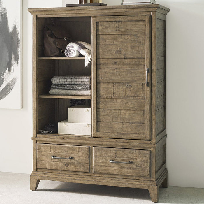 Discover the perfect blend of style and storage with the Wheeler Door Chest from the Plank Road Collection. Crafted from genuine New Zealand Pine, this solid wood masterpiece boasts seven spacious drawers and a versatile door compartment, offering ample room for your wardrobe essentials. Inside the door, two adjustable shelves allow for customizable organization to suit your needs. The chest's rustic charm is complemented by practical features, including hand-holds in the back for easy mobility and a sturdy center foot for unwavering support. With its timeless design and robust construction, the Wheeler Door Chest stands as a testament to quality craftsmanship, promising to be a cherished addition to your bedroom for years to come. This piece effortlessly combines functionality with rustic elegance, making it an indispensable part of your home.